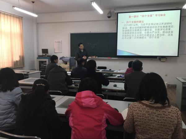 11月2日下午,爱爱视频 在实验楼N303召开以“四个全面”战略布局为主题的专题党课,院长于晓利、党总支书记李俊柱以及全体教工党员参加此次学习,由院长于晓利主讲。