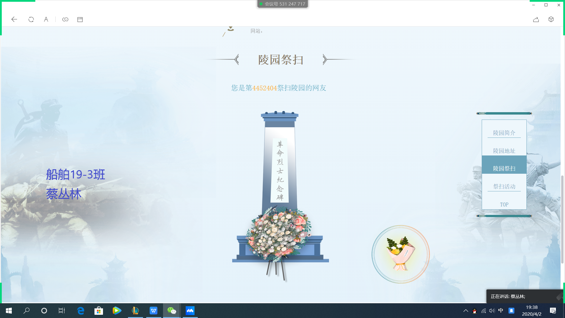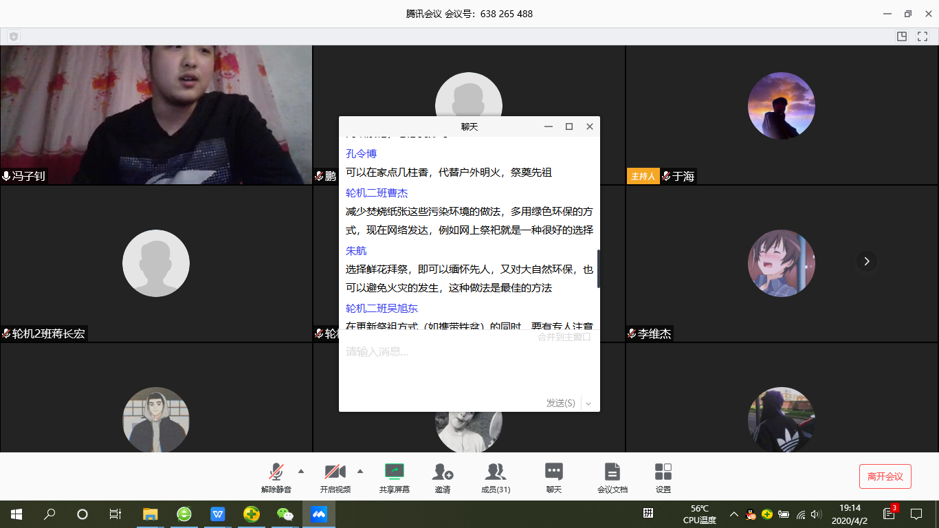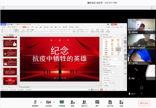 利用晚自习时间,2019级各班级在辅导员王海鹏组织和2018级班导师学生助理的配合下,利用网络资源开展“清明祭英烈-网上签名寄语”活动,以此缅怀烈士丰功伟绩,追忆烈士之德。活动过程中,有的班级观看了《全国重特大火灾案例选编》等视频,有的班级将新冠肺炎防疫中的典型人物事迹进行梳理,以《纪念抗疫中的英雄》PPT形式在班级视频会议中汇报。大家在会议记录中纷纷写下了体会和寄语,并在网上进行陵园祭扫和签名献花。高年级学生纷纷在朋友圈中缅怀英烈。通过以上行为,大家进一步了解了烈士们为祖国为人民抛头颅、洒热血,不惜牺牲自己生命的感人事迹,更深刻地体会到了先烈们那种坚贞不屈、英勇无畏的高贵品质。向先烈们表达自己的敬仰与感激的同时,大家也纷纷意识到了肩上的历史重任,要以革命先烈为榜样,努力奔跑,奋斗逐梦,只争朝夕,不负韶华。