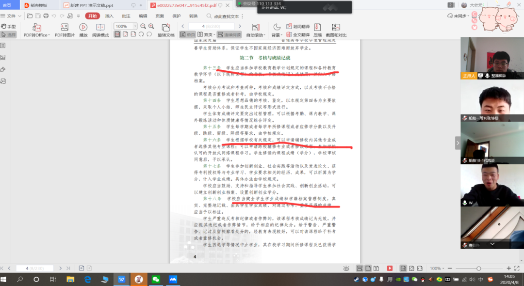 葛泰亨和大家交流了自己在疫情期间的感悟和体会,他说:“正因为那些有责任心的人在默默坚守,我们才能多一份安心。”之后带领我们学习最新版的大连海洋大学《学生手册》,本次学习着重教育教学篇,学习了本科生学分制学习管理规定以及选课管理办法,通过学习,大家深入领会学生手册精髓,认真研讨了本科生课程考核、成绩管理办法,以及毕业事项等内容。