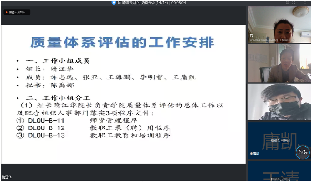5月20日通过钉钉平台学院召开了质量体系和课程认证工作推进会,隋江华院长主持会议。学院班子成员许志远、张亚、李明智、王海鹏、航海轮机教研室相关教师、实验室主任副主任、办公室等有关人员参加了会议。