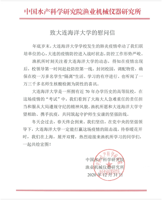 12月31日下午,中国水产科学研究院渔业机械仪器研究所向我校发来慰问信,慰问奋战在疫情防控工作一线的老师和同学们,并向他们致以了崇高的敬意。该所研张祝利老师,给我校研究生捐赠了抗疫物资,助力学校抗疫工作。