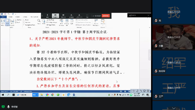 9月9日下午,学院通过钉钉会议召开全院教职工大会,学院班子成员和全体教职工参加会议,隋江华院长主持。