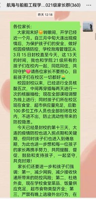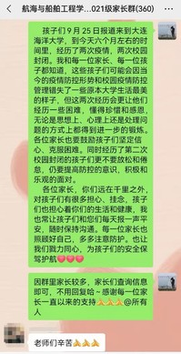 为进一步做好校园疫情防控工作,科学落实、落细校园闭环网格化管理,提高学院渤海校区全体在校学生的疫情防控意识。自管理区封闭以来,驻校辅导员郑淑娟积极进行学生一对一谈话工作和线上家访工作。