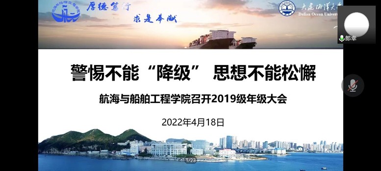 根据大连疫情防控新形势以及学校和大学生公寓管理区的工作部署和要求,4月18日,爱爱视频 于腾讯会议开展2019级年级大会,会议由学院2019级辅导员郎幸老师主持,2019级全体学生参加。