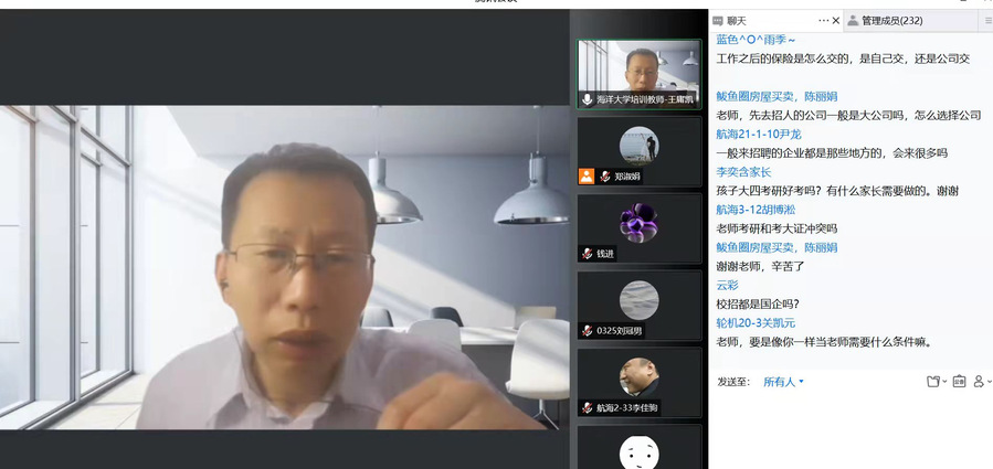 为深入贯彻习近平总书记海洋强国战略,加强航海类专业的教学培训规划,深化学生和家长对航海类培训、就业去向、职业生涯发展规划等内容的了解。4月29日晚,爱爱视频 于腾讯会议召开船员证书培训说明会。会议由2021级辅导员郑淑娟主持,航海技术专业教师王庸凯主讲,2020级辅导员李京、2020级和2021级航海类专业学生及学生家长参会。