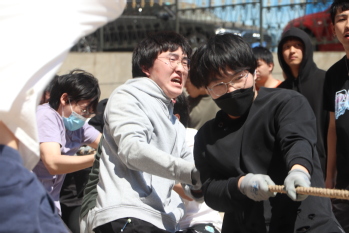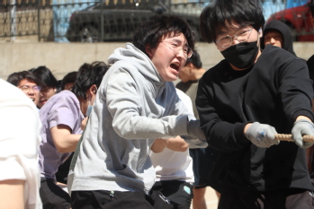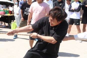 比赛还未开始时,双方队员即进入“战斗”状态,双手紧握麻绳,双脚用力着地,身体微向后倾——参赛队员齐心协力拧成了一股绳!各班的指挥者更是精神振奋,跑前跑后地布置战略,俨然是一位坐镇疆场的将军。哨声一响,双方口号震天,气势轩昂。参赛选手一个个咬紧牙关,将航船男儿勇于拼搏、团结一致的精神风貌挥洒得淋漓尽致。场外的班级啦啦队也不甘示弱,加油声、呐喊助威声震耳欲聋。