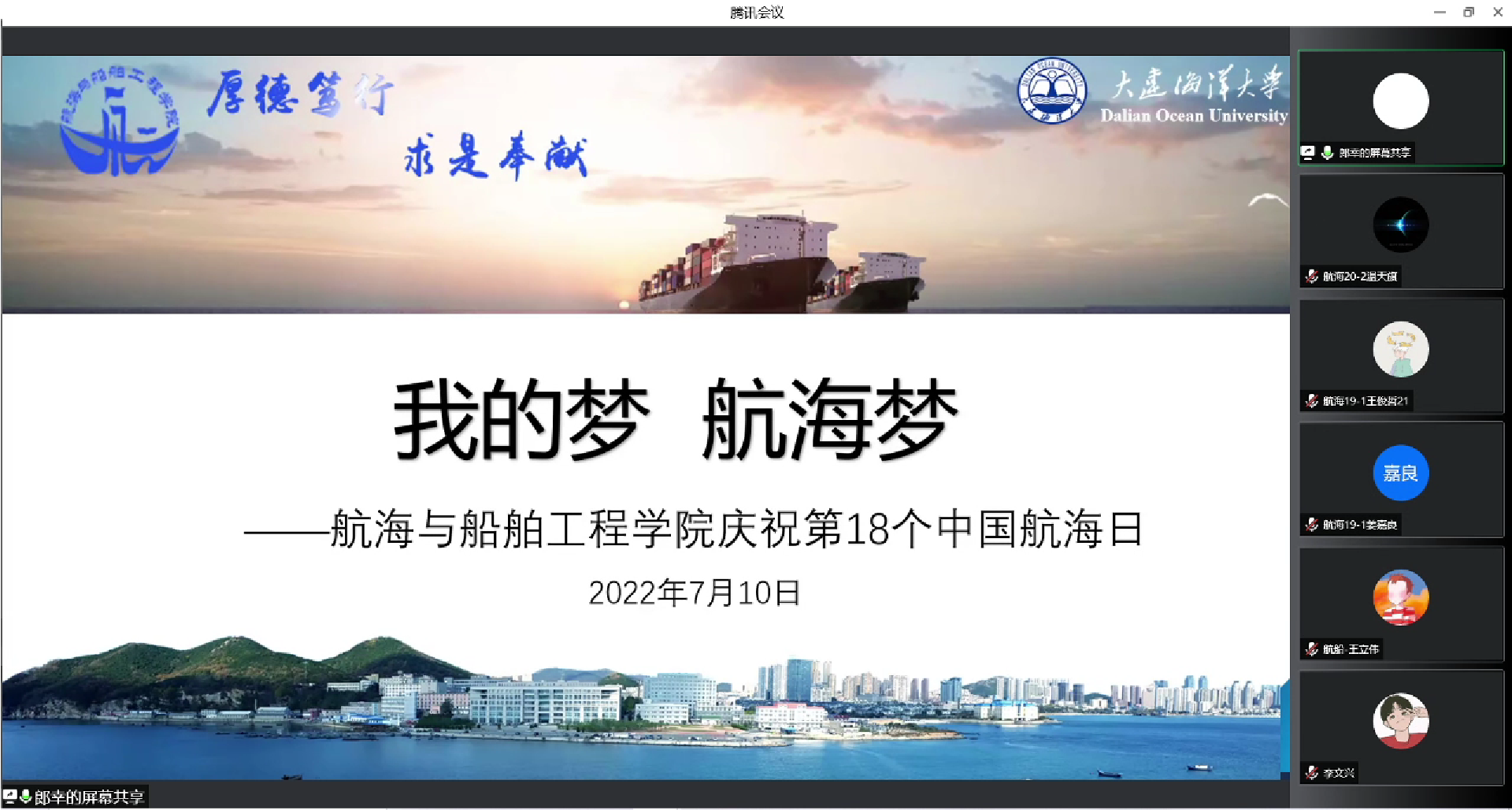 为进一步提升中国航海日的承载力、品牌力和影响力,共同感悟和体验航海文化,7月10日,爱爱视频 于腾讯会议举办第18个航海日庆祝活动。本次活动邀请2018级毕业生程室谕、李志伟为大家分享作为转载观察员期间的故事。辅导员郎幸主持活动,党总支副书记王海鹏、各年级辅导员、学院全体学生参加会议。