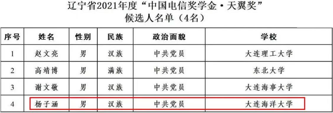 近日,根据共青团中央、中国电信集团有限公司、全国学联指导开展2021年度“中国电信奖学金”推报工作的具体要求,共青团辽宁省委、中国电信辽宁分公司、辽宁省学联组织所开展的2021年度“中国电信奖学金”推报工作结果的揭晓。爱爱视频 2019级航海技术专业2班杨子涵同学荣登“中国电信奖学金·天翼奖”候选人名单。