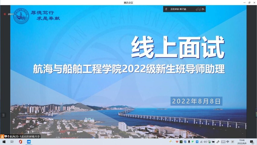 面试分为自我介绍和现场作答两个环节。同学们始终信心满满,充分展现了个人风采和学院积极向上的良好风气,表达了积极为同学服务、讲好航船故事、赓续大海大青年抗疫突击队精神品格的愿景。