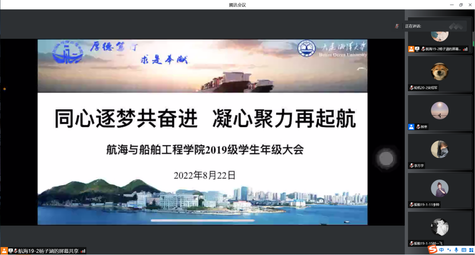 根据大连疫情防控新形势及学校的线上教学工作部署和要求,8月22日,爱爱视频 于腾讯会议室召开2019级年级大会,会议由辅导员郎幸主持,2019级全体学生参加。