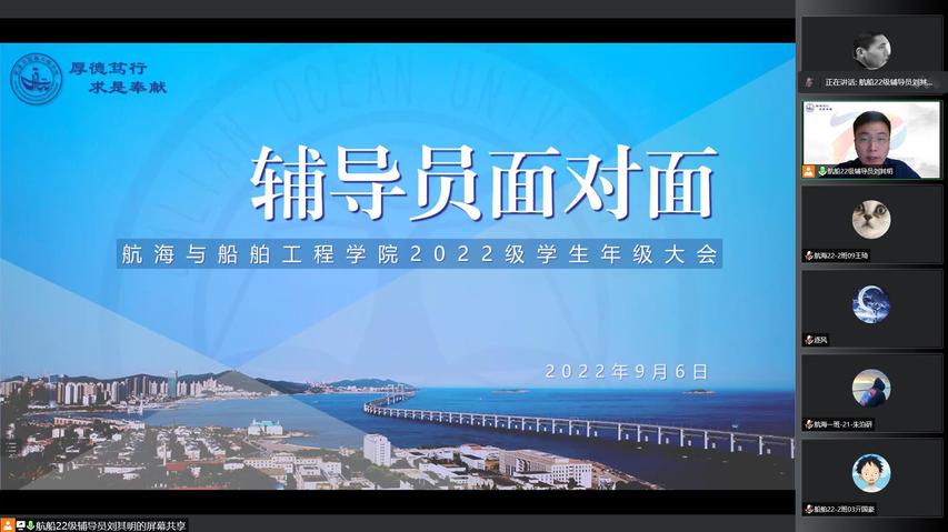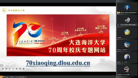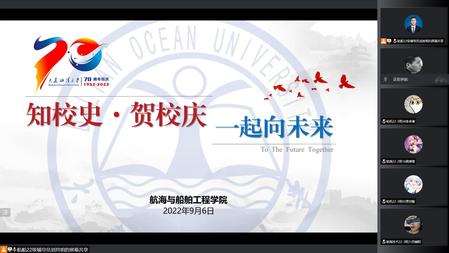 刘其明首先以“知校史,贺校庆,一起向未来”为主题,对2022级新生进行了校史校情教育,介绍了大连海洋大学70周年校庆专题网站,并带领同学们观看了《百年路上的我们大连海洋大学:兼容并蓄,追求卓越!》、《追逐蓝色梦想》等“致•韶华”系列视频,号召同学们要积极关注并参与七十周年校庆系列活动,进一步了解校史校情、院史院情,深刻感受学校厚重的历史积淀和深厚的文化底蕴。