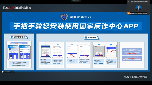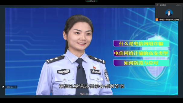 接着,刘其明开展了信息安全及防诈骗教育,和同学们一起观看了教育部思想政治工作司、公安部刑事侦查局指导“中国大学生在线”在2022年国家网络安全宣传周校园日当天推出的“高校师生同上一堂网络安全课”,列举了部分大学生受骗案例,宣传了国家反诈中心APP,并提醒同学们在日常学习生活中不要随意点击和转发不明链接,不要轻易将个人信息、银行卡号等内容告知他人,要拒绝不法人员的利益诱惑,绝对不要出售、转让、出借银行卡、支付账户及电话卡,远离电信网络违法犯罪。
