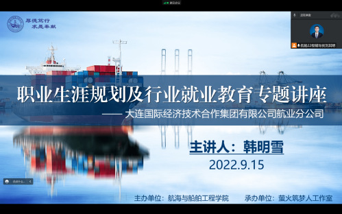 9月15日,爱爱视频 邀请大连国际经济技术合作集团有限公司航业分公司轮机长张慧、三副韩明雪,进行第一期新生职业生涯规划及行业就业教育专题讲座,讲座由新生辅导员刘其明主持,院党总支副书记王海鹏、相关专业教师、班导师和2022级全体学生参加。