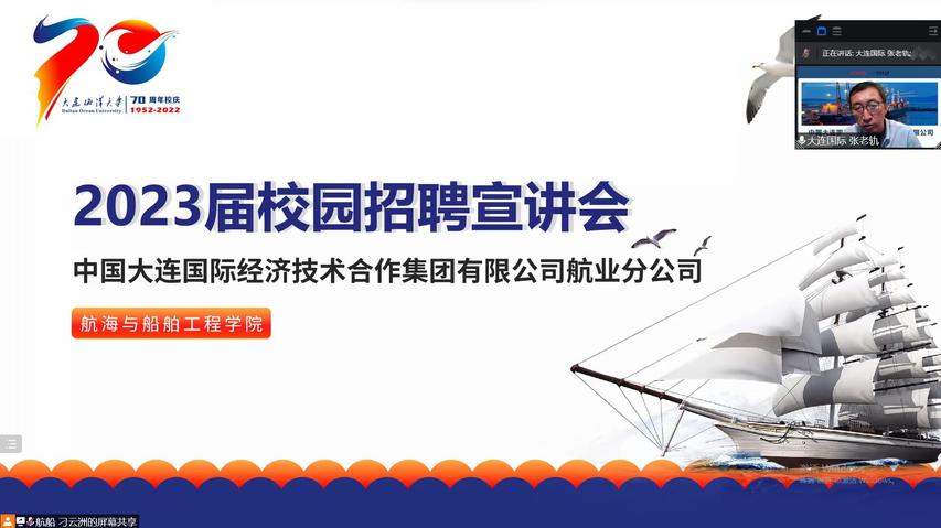 9月19日,爱爱视频 邀请中国大连国际经济技术合作集团有限公司航业分公司,于腾讯会议开展线上2023届毕业生就业招聘宣讲会。轮机长张慧主讲,学院党总支副书记王海鹏、2019级辅导员郎幸、2019级航海技术、轮机工程专业学生参加本次会议。