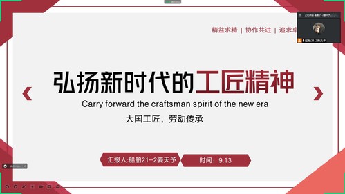 各个班级围绕敬业、精益、专注、创新等工匠精神的基本内涵,从现实出发,通过视频、示例、故事等展示属于新时代的工匠精神,让同学们理解工匠精神被时代赋予的新意义,帮助学生形成正确的道德观、价值观、工作观,培养适应新时代的劳动者。