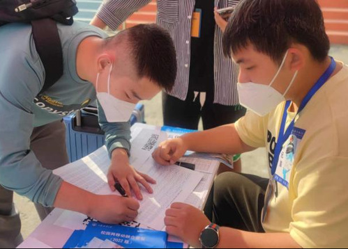 9月26日,2022级新生辅导员刘其明与志愿者们于迎新地点预先就位,多次召开迎新工作会议,合理分配工作,清点摆放迎新物资,布置迎新现场,做好了以最佳面貌迎接每一位新生到来的准备。同时,为让新生在入校第一时间体会到家的温暖,学院依托微信小程序开展线上“绿色通道”申报工作,并逐一电话回访,确保解决学生最急迫的需要。