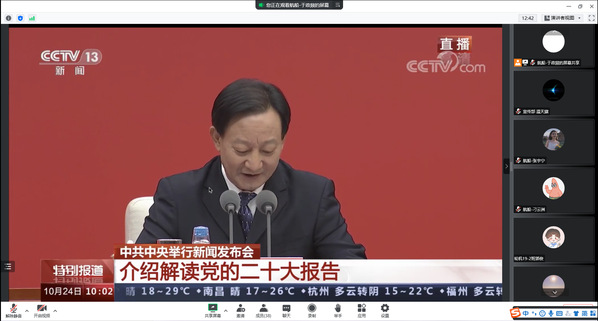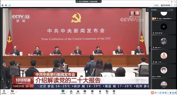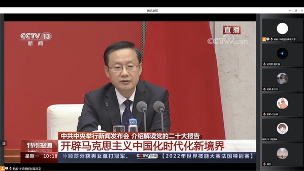 会议伊始,同志们一同观看了《解读党的二十大报告》中共中央新闻发布会,听取了对党的二十大报告主要精神的专业解读,深刻认识和体会了新时代的伟大变革、“两个结合”、高质量发展、法治社会的建设以及党的建设和重要部署等相关内容。