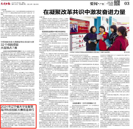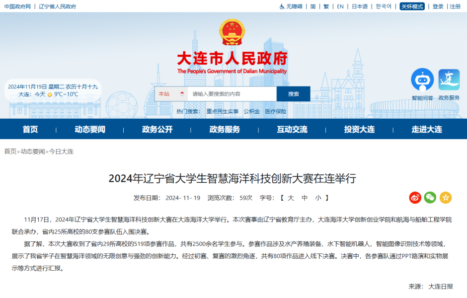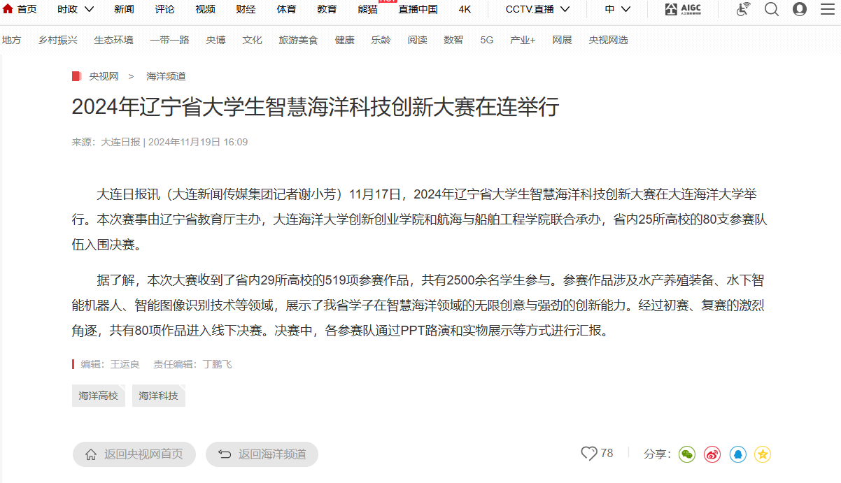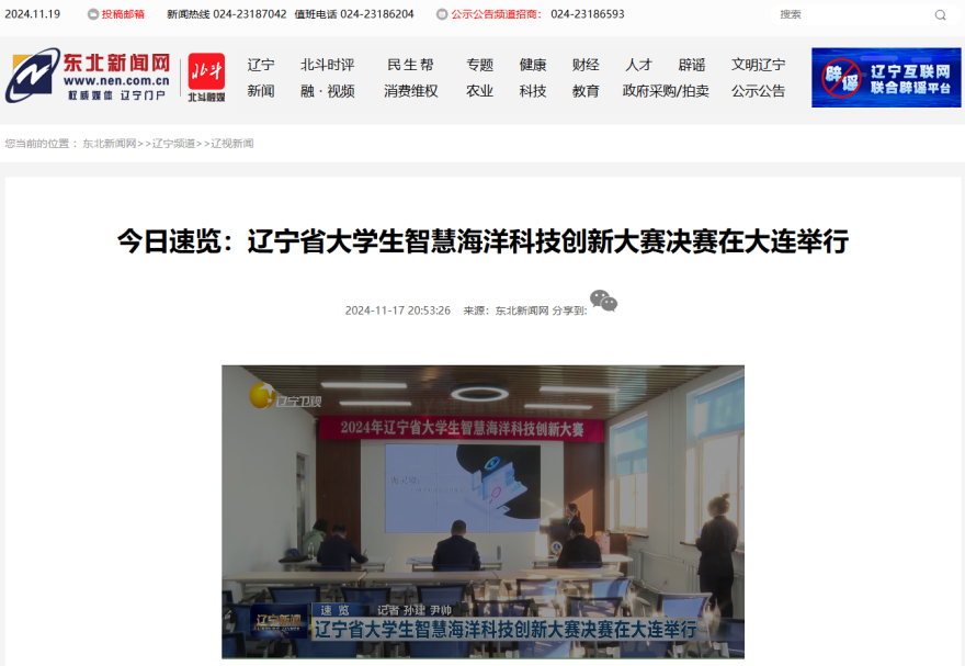 近日,辽宁电视台、大连电视台、辽宁日报、大连日报、央视网、大连政府网和东北新闻网等多家媒体报道我校举办的2024年辽宁省大学生智慧海洋科技创新大赛。本次大赛收到了省内29所高校的519项参赛作品,共有2500余名学生参与。参赛作品涉及水产养殖装备、水下智能机器人、智能图像识别技术等领域,展示了我省学子在智慧海洋领域的无限创意与强劲的创新能力。经过初赛、复赛的激烈角逐,共有80项作品进入线下决赛。决赛中,各参赛队通过PPT路演和实物展示等方式进行汇报。