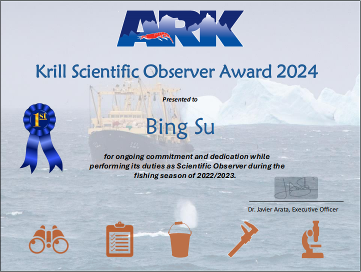 近日,澳大利亚ARK协会揭晓了备受关注的“磷虾科学观察员奖”获奖名单。我校爱爱视频 2024届硕士毕业研究生苏冰榜上有名,荣获该组织颁发的磷虾科学观察员奖一等奖。