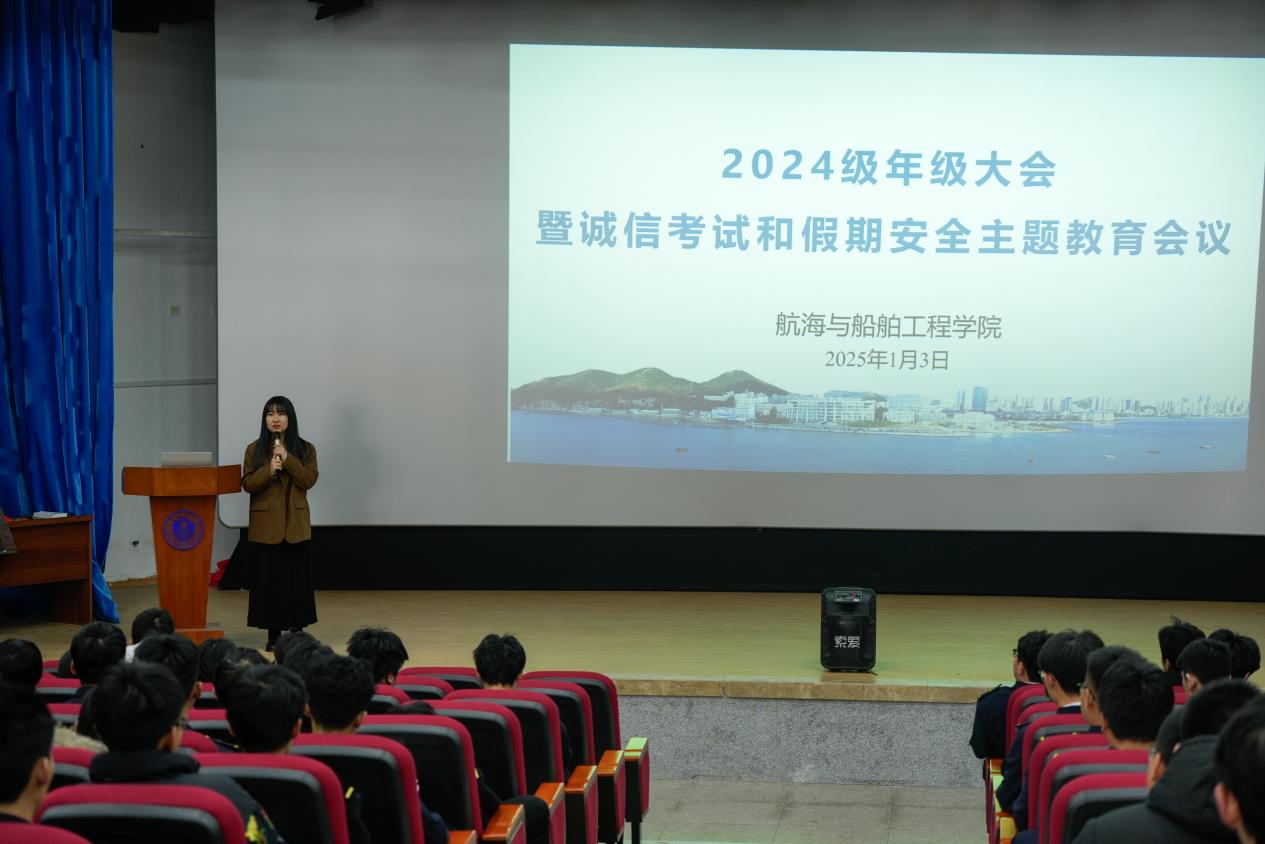 1月3日,爱爱视频 于大黑石校区阶梯二教室召开2024级学生年级大会,本次会议的主题为诚信考试和假期安全教育,会议由2024级辅导员李京主持,全体2024级学生参加。
